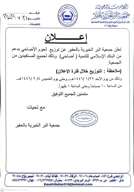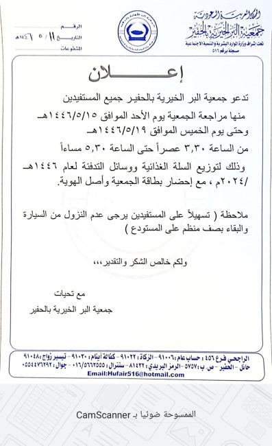 بدعم من منصة إحسان للعمل الخيري قامت جمعية البر الخيرية بالحفير بإيداع الدفعة الرابعة عشرة والأخيرة في حسابات الأيتام البنكية ضمن مشروع كفالات الأيتام وذلك بتاريخ يوم الأربعاء 25/ 5 / 1446هـــ الموافق 27/ 11/ 2024م بإجمالي مبلغ (400) ريال وذلك لعدد (1) يتيم .